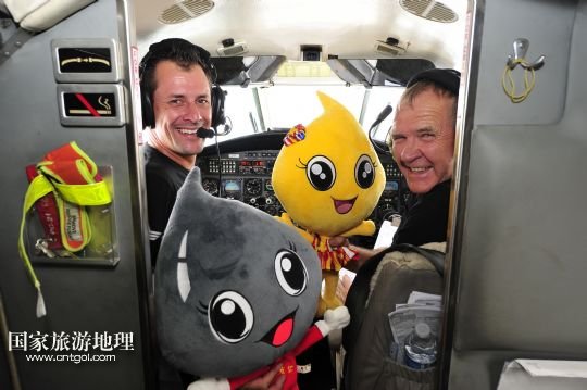 8月14日,百年靈噴氣機(jī)隊保障機(jī)飛行員呂克(左)和飛行隊負(fù)責(zé)人奈杰爾(右)在飛近克拉瑪依時,揮舞克拉瑪依航空旅游節(jié)吉祥物“克拉”和“瑪依”以示慶祝。