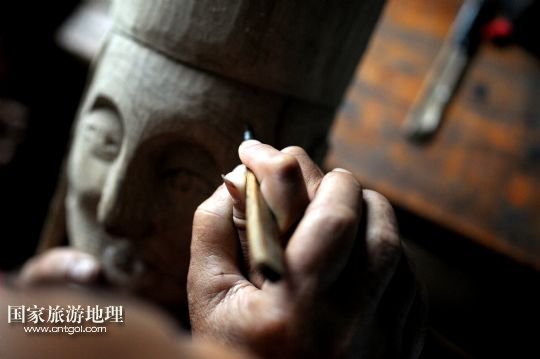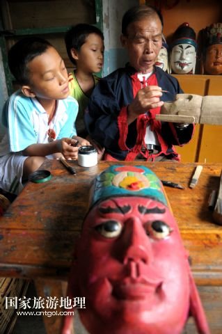 譚圣慈老人今年72歲,從22歲開始學(xué)雕刻儺戲面具,迄今,已經(jīng)堅(jiān)持了50年。老人說,他制作的面具因工藝精湛,造型優(yōu)美,曾吸引遠(yuǎn)方的客人高價(jià)購買。但是,卻少有人來學(xué)習(xí)面具的雕刻與制作。儺戲于2006年被列入非物質(zhì)文化遺產(chǎn)名錄之后,政府加大了保護(hù)力度,但因?yàn)槊婢叩闹谱髦芷陂L(zhǎng)、工序復(fù)雜,銷售渠道少等原因,仍無法吸引年輕人學(xué)習(xí)雕刻的興趣。為了收到心儀的徒弟,傳承這獨(dú)到的技藝,他到處發(fā)布免費(fèi)收學(xué)徒的信息。在他的堅(jiān)持下,今年暑期,鄉(xiāng)里有兩名對(duì)面具制作感興趣的男孩來到譚圣慈身邊學(xué)藝。老人高興地說:“我給他們講很多故事,就是希望他們能對(duì)此提起興趣,愛上木面雕刻,別讓這老手藝失傳了。” /新華社發(fā)