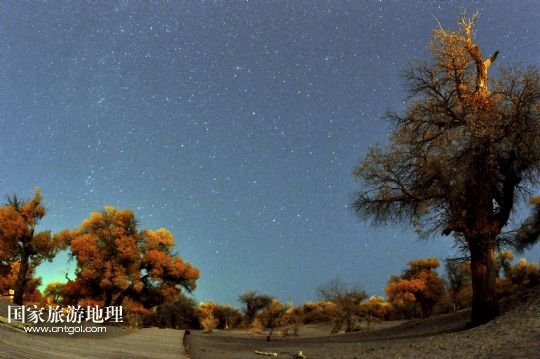 這是10月10日在內蒙古阿拉善盟額濟納旗拍攝的星空下的胡楊林。