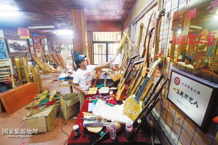 國(guó)家旅游地理 廣西柳州11月11日訊(記者陸旺楊春) 牽手漫步龍?zhí)睹琅?,并肩靠背沐浴晚秋暖?yáng),你會(huì)時(shí)常聽到一串串動(dòng)人的音符:它時(shí)而渾厚圓潤(rùn)、清脆響亮,時(shí)而輕靈縹緲、悠長(zhǎng)凄美。不忍打破這份寂靜閑情,卻又忍不住猜想:這是何方人士,用何種樂器,吹拉彈撥出如此佳音?穿越叢林,循聲走去,瑤寨庭前,幾個(gè)年輕男女手握蘆笙,身子左搖右晃,吹得正起興。步入瑤寨一樓才發(fā)現(xiàn),這里儼然一個(gè)生產(chǎn)民族樂器的大工廠:木板、竹竿、鐵鋸、膠水、油漆,以及形狀酷似牛頭、牛腿、魚身、龍身等顏色各異、五花八門的樂器……一位正在給樂器上漆的中年人梁志榮告訴記者,這是龍?zhí)豆珗@正在籌建的民族樂器館,也是魚峰區(qū)創(chuàng)建廣西文化強(qiáng)區(qū)的特色景區(qū)之一,他現(xiàn)在是大龍?zhí)睹褡逅囆g(shù)團(tuán)團(tuán)長(zhǎng),研究、制作民族樂器將近20年,曾獲“廣西民間工藝大師”和“十佳民間藝人”稱號(hào)。