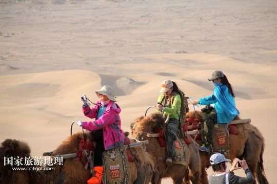 5月18日,游客乘駱駝在甘肅省敦煌市鳴沙山月牙泉景區(qū)欣賞大漠風光。