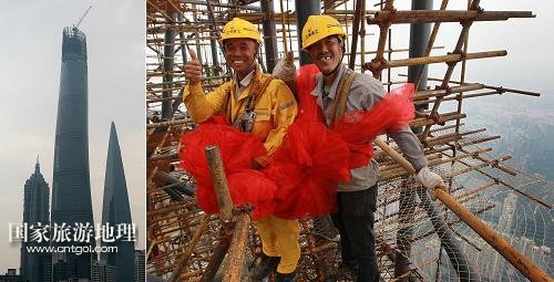 8月3日,上海機(jī)械施工集團(tuán)公司的工程人員在“申城之巔”慶祝塔冠結(jié)構(gòu)工程完工。
