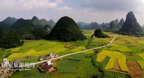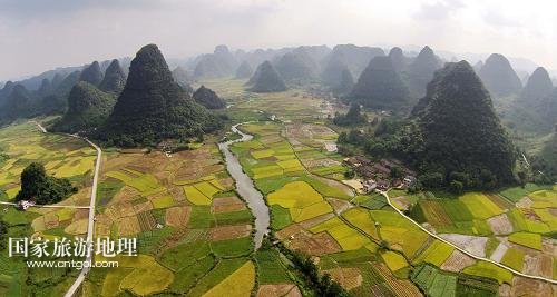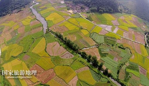 國家旅游地理 廣西柳州8月21日訊 8月20日在廣西柳州市融安縣泗頂鎮(zhèn)泗頂村航拍的田園風(fēng)光。“立秋”過后,地處桂北山區(qū)的廣西柳州市融安縣進入稻谷收獲的季節(jié),金黃的稻田與原生態(tài)的山水風(fēng)光構(gòu)成一幅美麗的豐收圖。新華社發(fā)(譚凱興 攝)