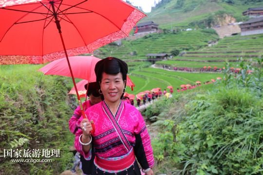 6月29日,在廣西桂林龍勝各族自治縣泗水鄉(xiāng)潘內(nèi)瑤寨,紅瑤婦女盛裝參加活動。