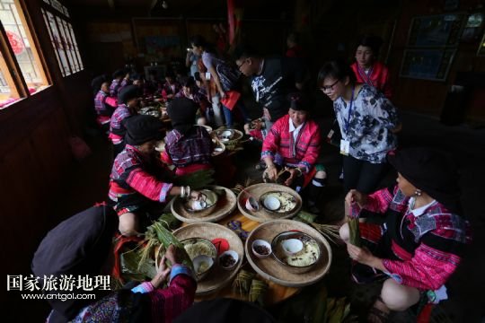 6月29日,在廣西桂林龍勝各族自治縣泗水鄉(xiāng)潘內(nèi)瑤寨,紅瑤婦女在“紅衣節(jié)”上包粽粑。